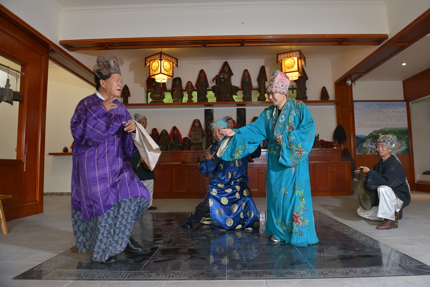 旺苍端公戏传承人何元礼和他的徒弟正在端公戏演练中