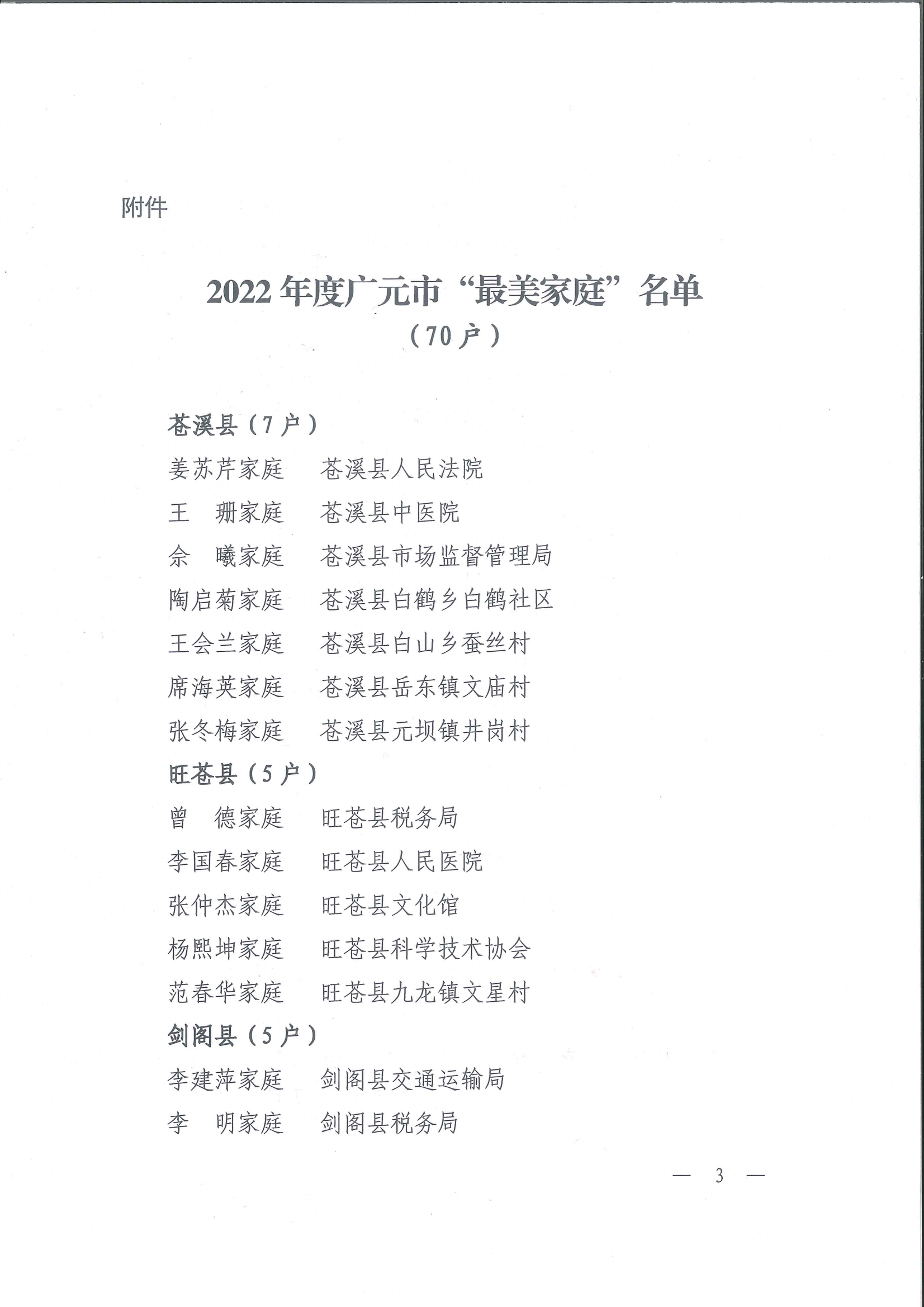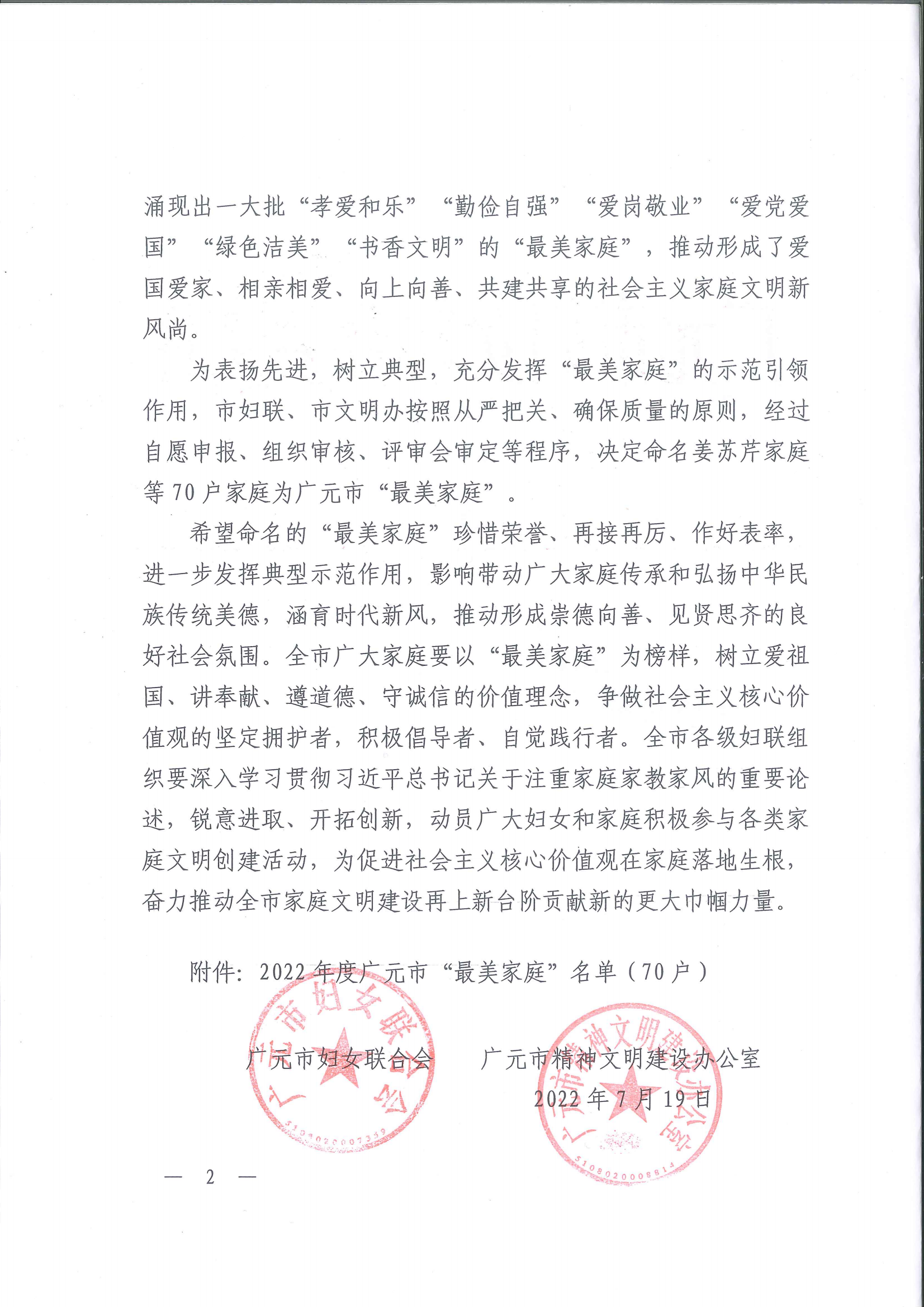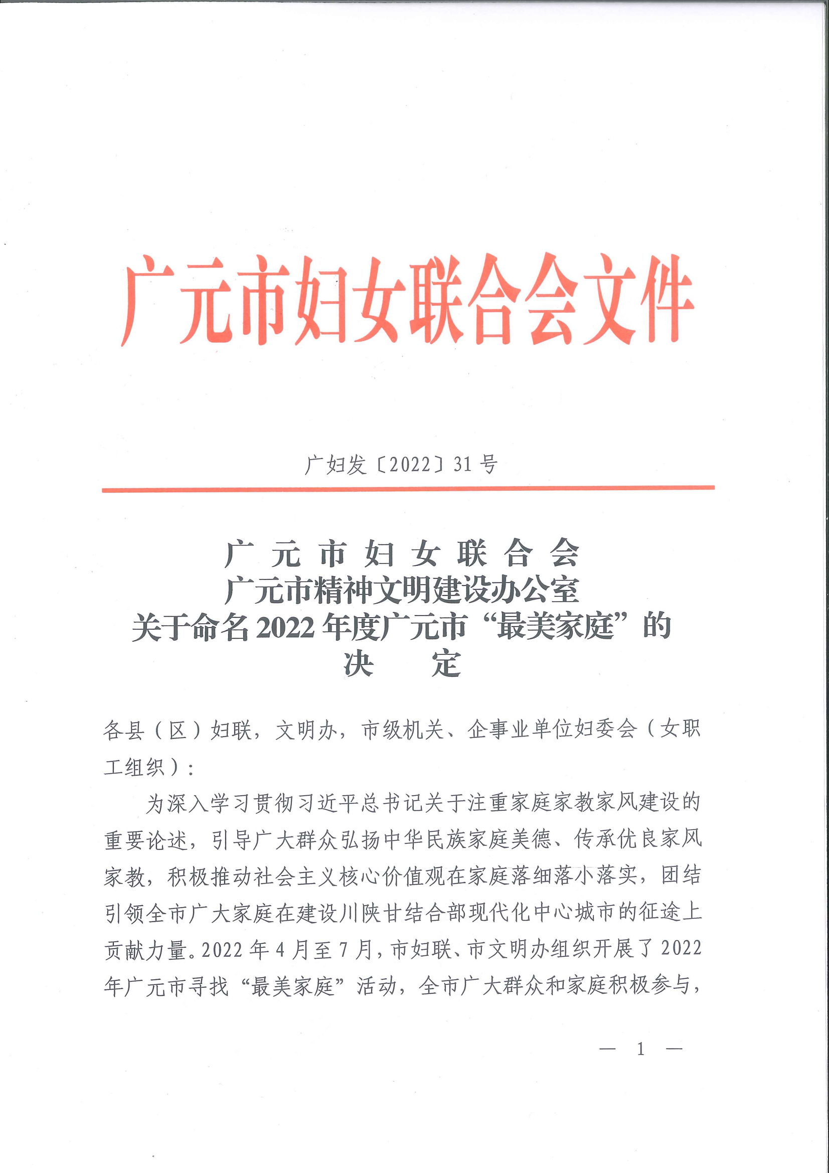 2022年4月至7月,广元市妇女联合会、广元市精神文明建设办公室组织开展寻找2022年广元市“最美家庭”活动,全市广大群众和家庭积极参与。经过自愿申报、组织审核、评审会审定等程序,决定命名全市70户家庭为广元市“最美家庭”。 旺苍县共有5户家庭荣获此命名,我馆张仲杰家庭入选其中。