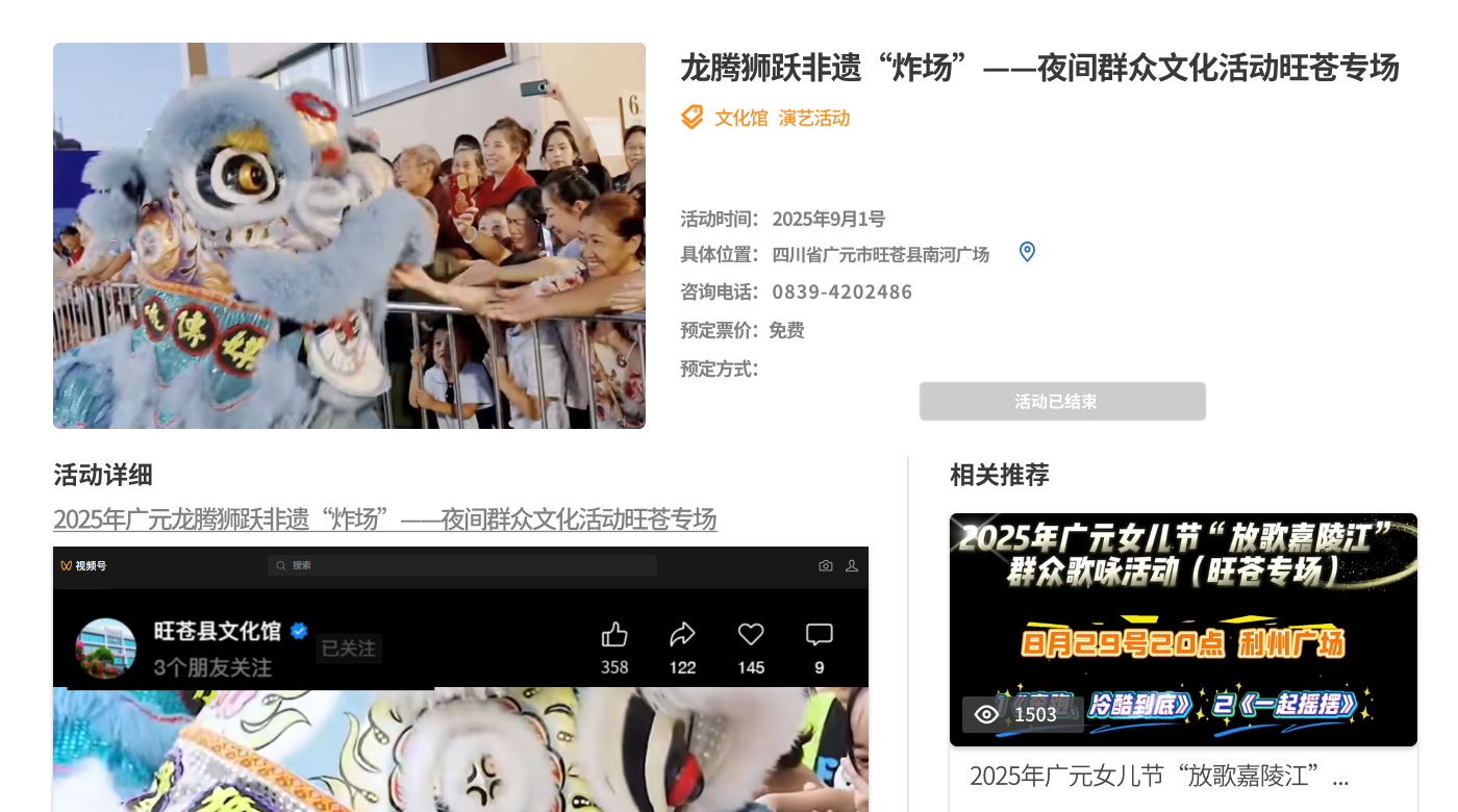 地址:四川省广元市旺苍县东河镇兴旺大道文体中心文化馆